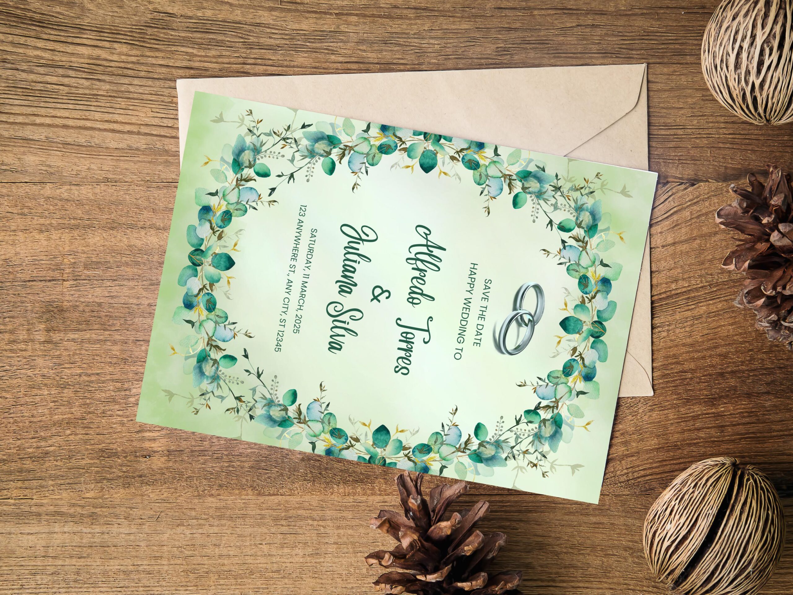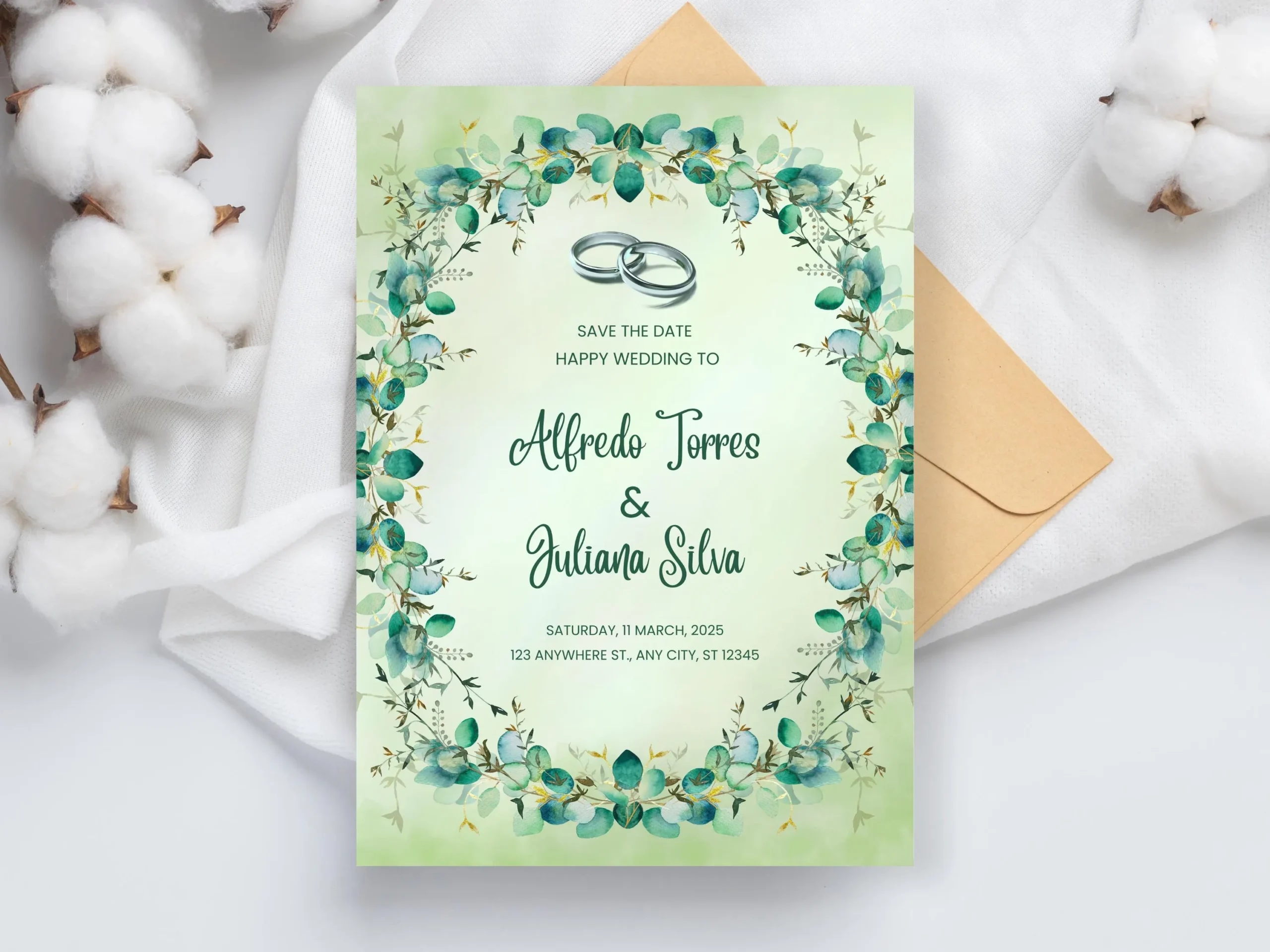 “Impress your guests with stationery that feels custom-designed—without the custom price tag. Our nature-inspired green palette and classic layout ensure your invitation radiates grace, while editable features make personalization a joy.”